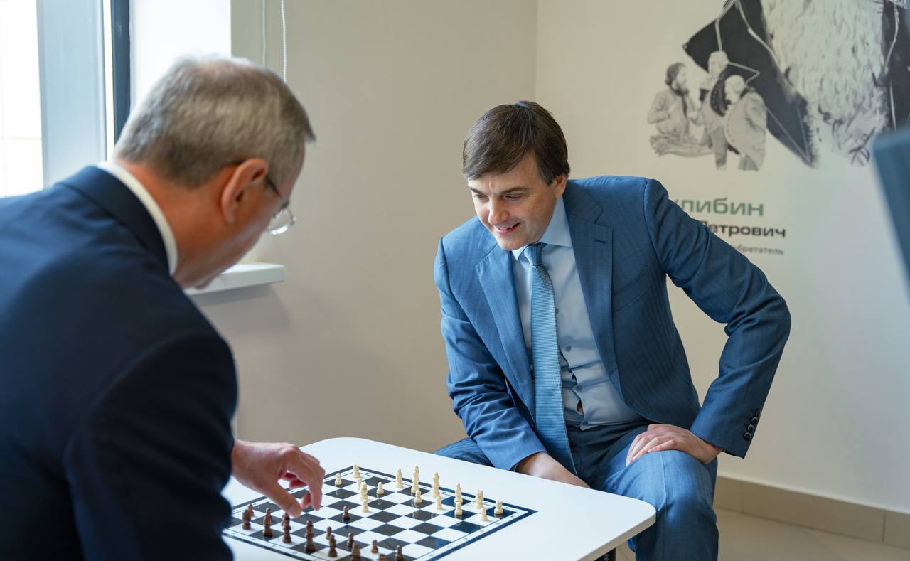 Перед началом мероприятия для гостей провели экскурсию по школе. В ходе неё в пространстве для игры в шахматы Сергей Кравцов и Владислав Шапша сыграли партию, итогом которой стала дружеская ничья.